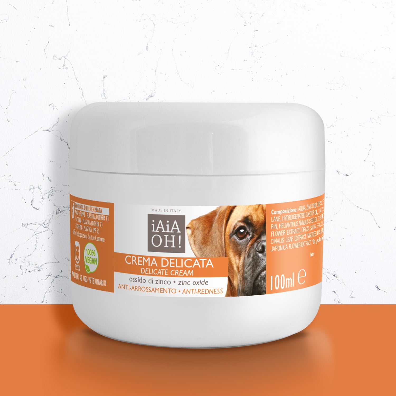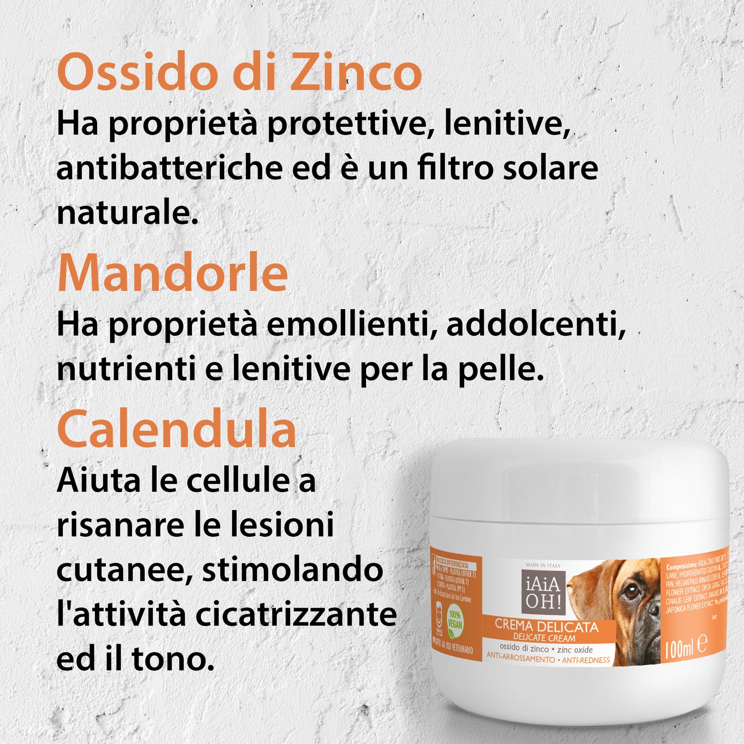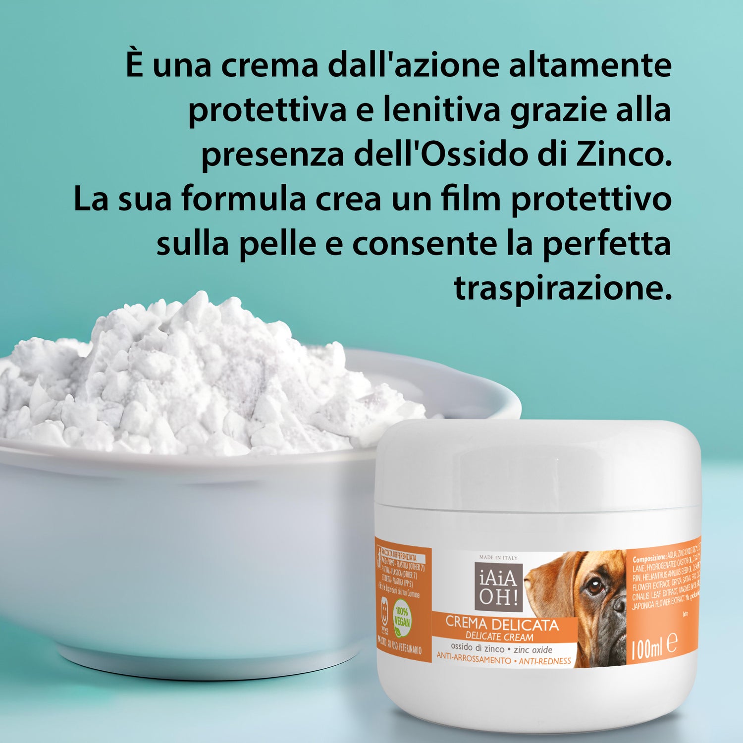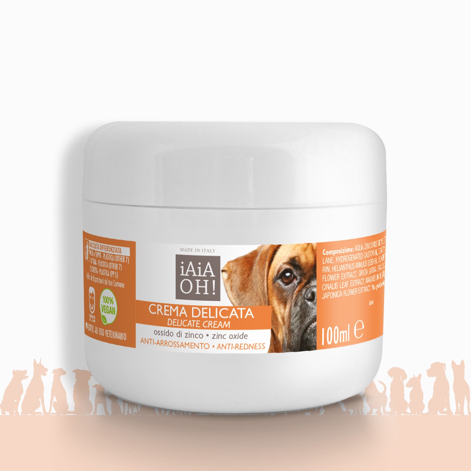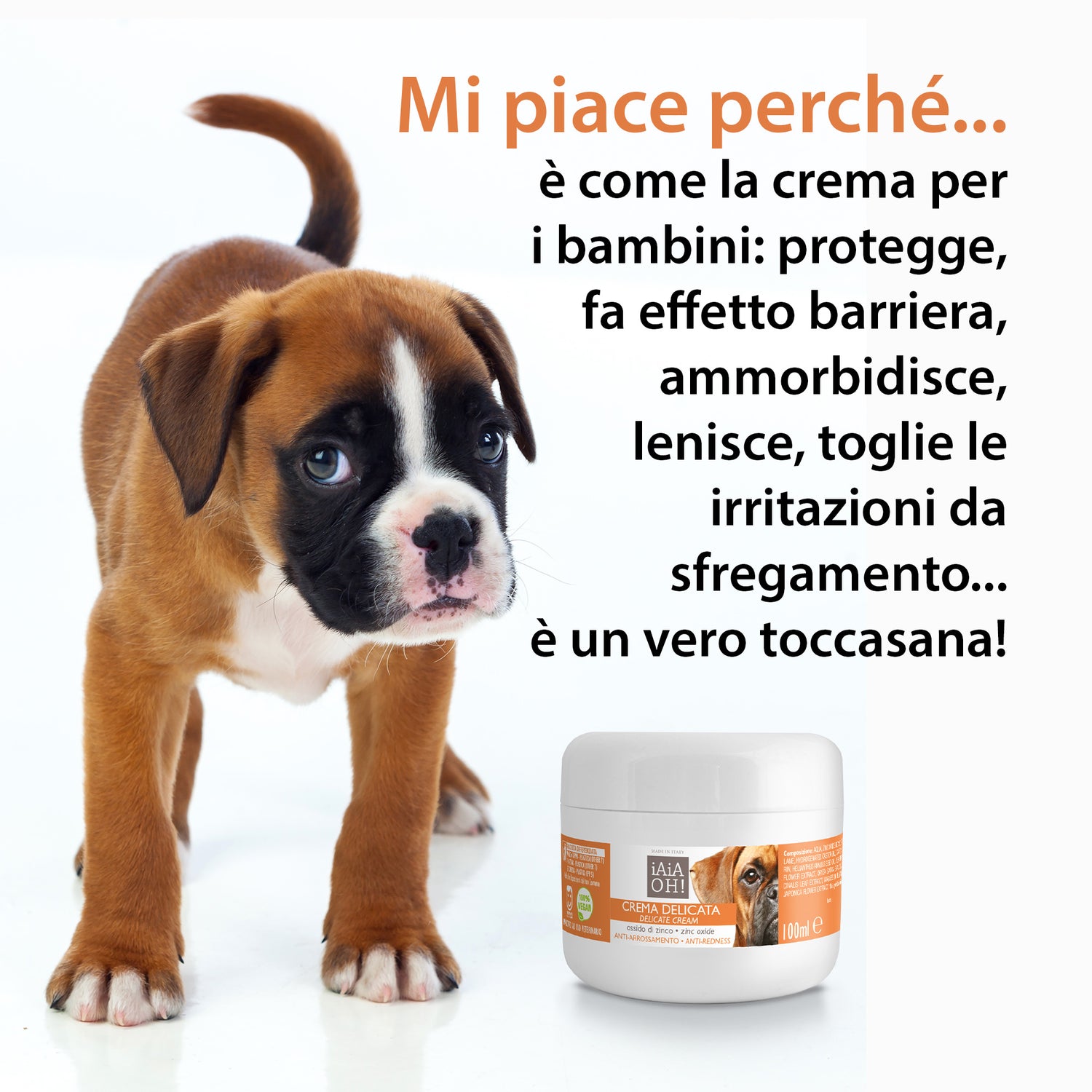 La Crema Delicata è specifica per irritazioni ed arrossamenti della cute del cane ed ha azione lenitiva. È una crema dall'azione altamente protettiva e lenitiva, grazie alla presenza dell'Ossido di Zinco. La sua formulazione permette la creazione di un film protettivo sulla pelle del cane, ma che ne consente la perfetta traspirazione. Grazie all'azione nutriente dell'Olio di Mandorle e dell'Aloe, previene irritazioni ed arrossamenti.