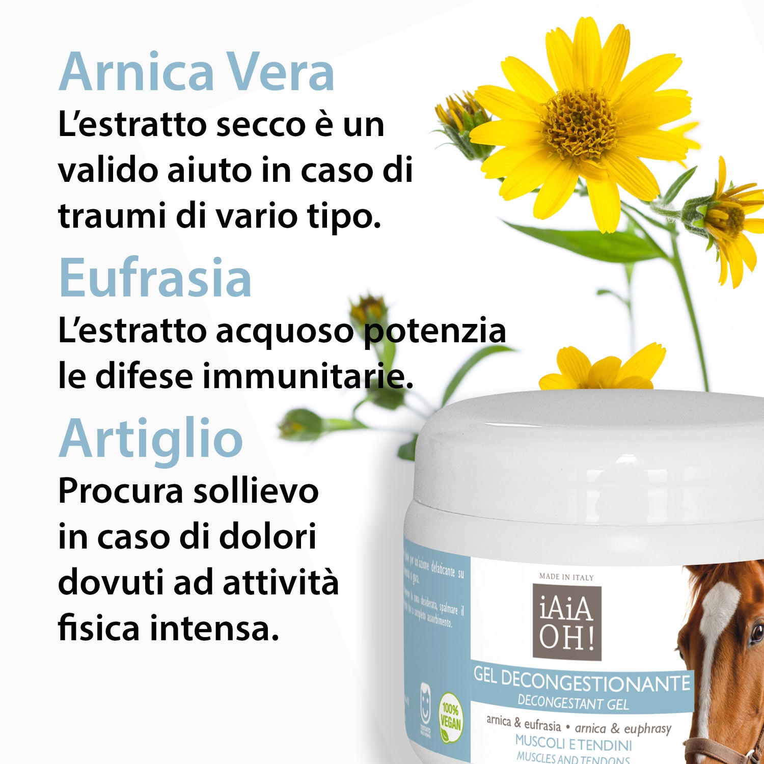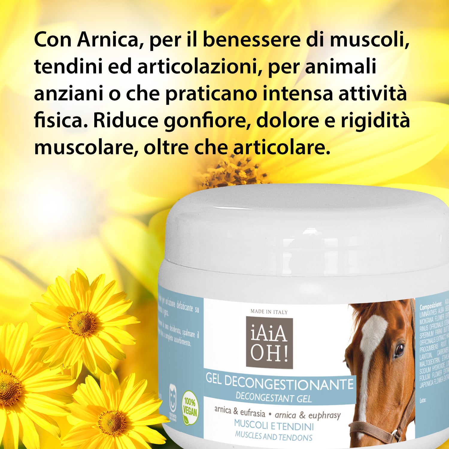 Il Gel Decongestionante Arnica è pensato per il benessere dei cavalli, sia atleti che anziani. La sua formula super concentrata, arricchita con estratto secco di Arnica, Artiglio del Diavolo ed Eufrasia, offre un'azione defaticante e un rapido assorbimento, garantendo sollievo immediato a muscoli, tendini e articolazioni.