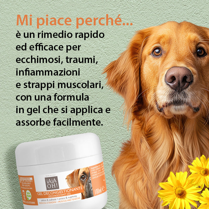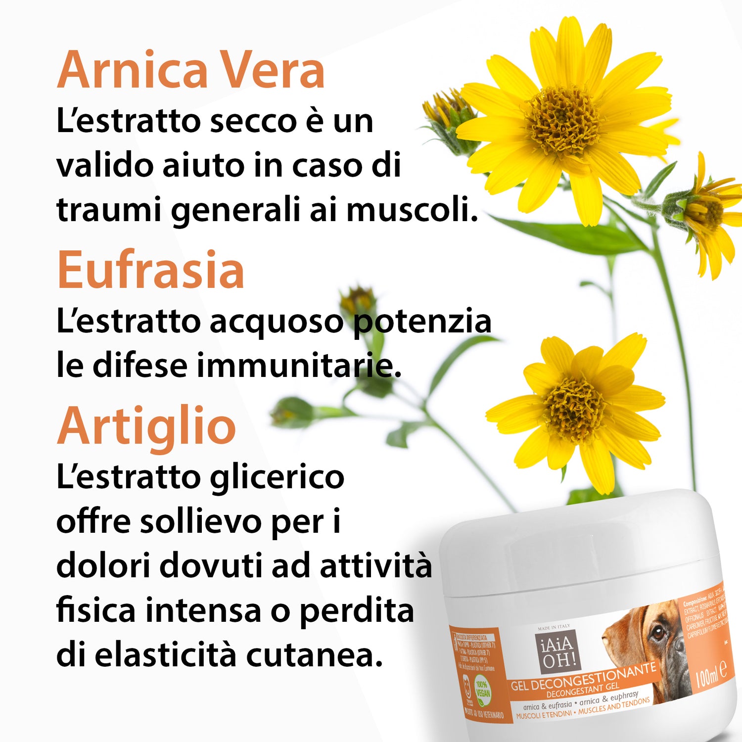 Arnica, Eufrasia ed Artiglio del Diavolo sono il rimedio più veloce ed efficace in caso di gonfiore, dolore e rigidità muscolare del vostro cane. La sua formula in gel gli permette di essere spalmato ed assorbito facilmente, donando immediata freschezza e benessere al vostro amico. Contiene Oli Essenziali naturali al 100% ed è senza conservanti, coloranti e profumi. Un mix di principi attivi perfetto per dare sollievo a muscoli e tendini.