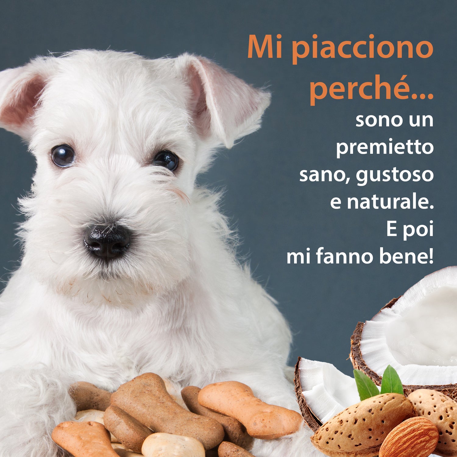 Coconut and Almond Snack Biscuits for dogs are a natural and highly digestible snack, rich in vitamins, minerals and fiber. Thanks to the combination of grated coconut and almond flour, they provide energy, aid digestion and contribute to the shine of the coat.
