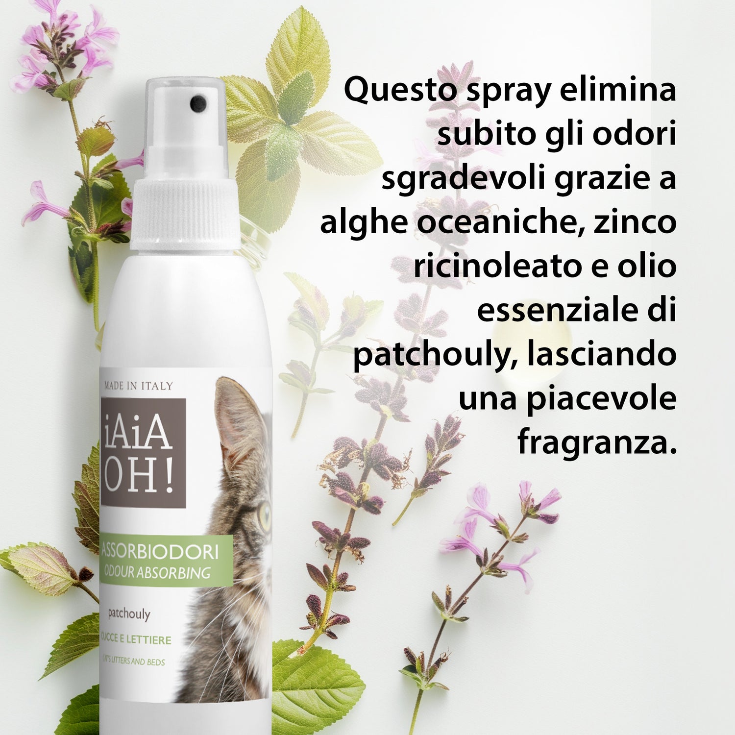 Assorbiodori cucce e lettiere Patchouly e alghe marine elimina in modo naturale e sicuro i cattivi odori da lettiere, cuscini e ambienti del gatto. Con Alghe Oceaniche, Zinco Ricinoleato e Olio Essenziale di Patchouly, neutralizza gli odori e lascia una profumazione delicata. Totalmente naturale e atossico, mantiene freschi e puliti gli spazi del tuo amico felino.